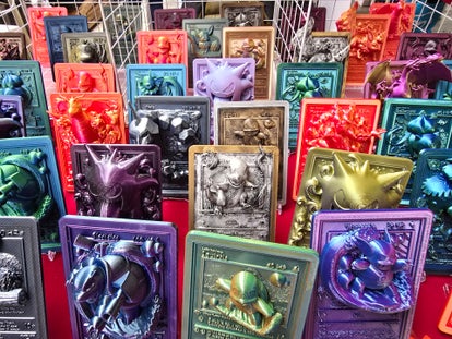 Een 3D-geprinte Pokémon-kaart heeft een uniek ontwerp waarbij elementen zoals afbeeldingen en tekst in de hoogte komen, waardoor de kaart een extra dimensie krijgt.